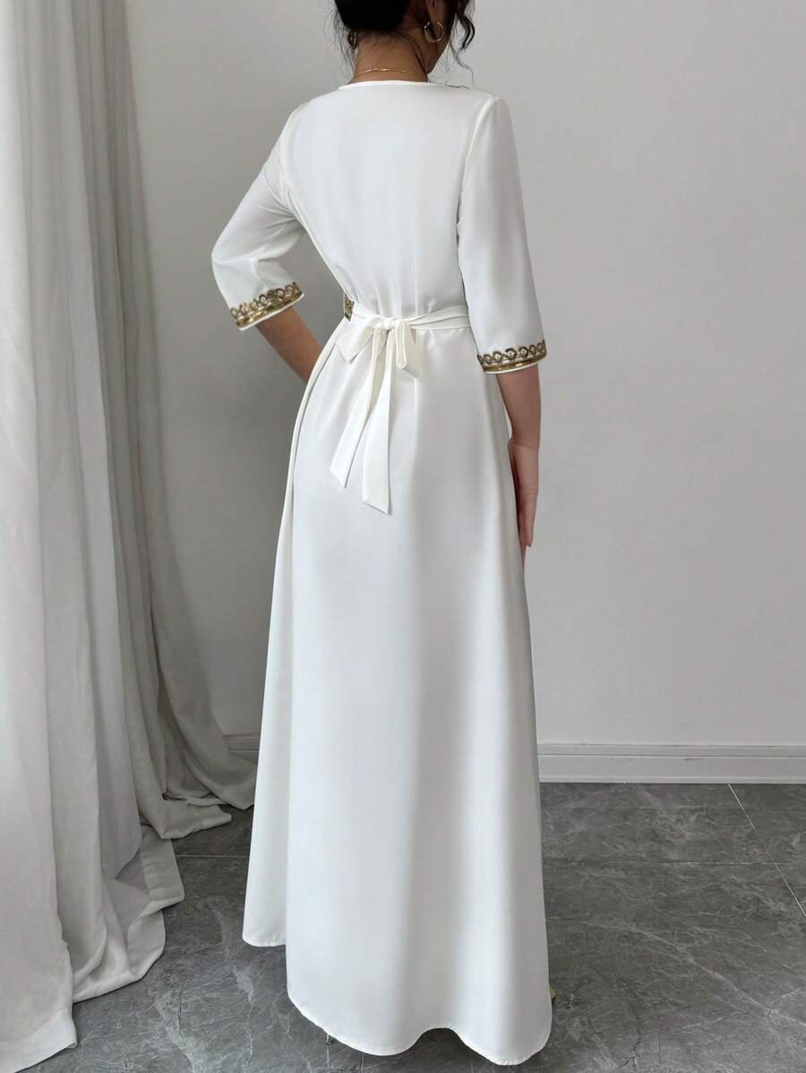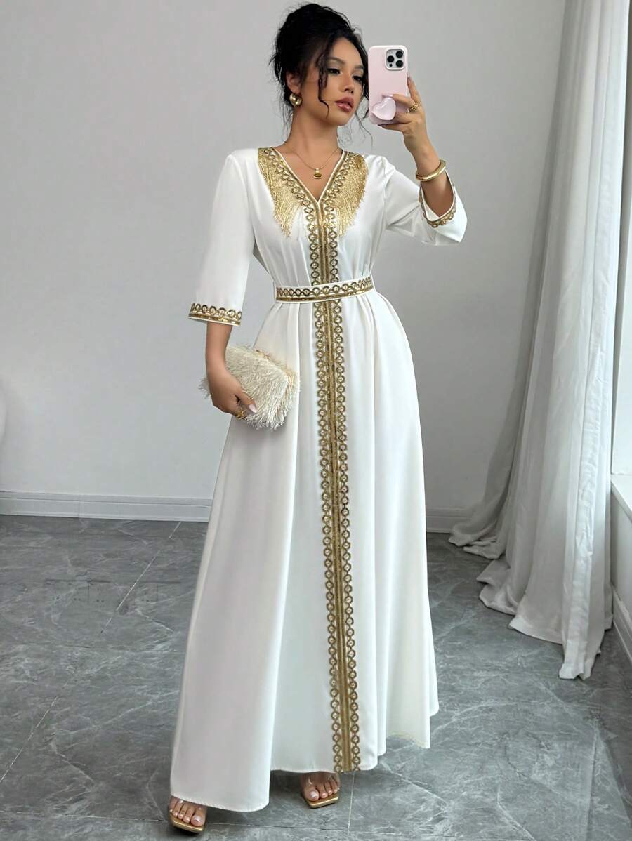 Women’s Vintage V-Neck Sequin Tassel Patchwork Midi Dress