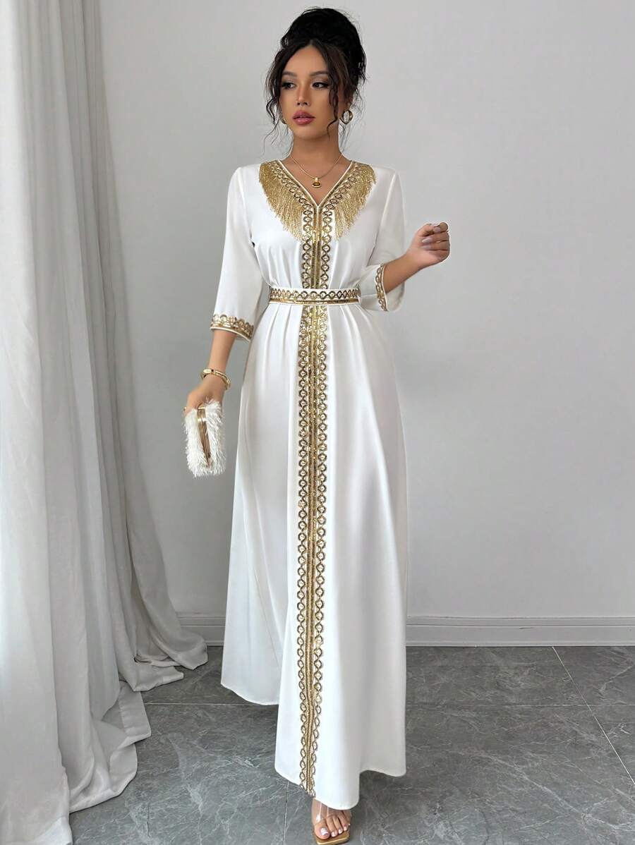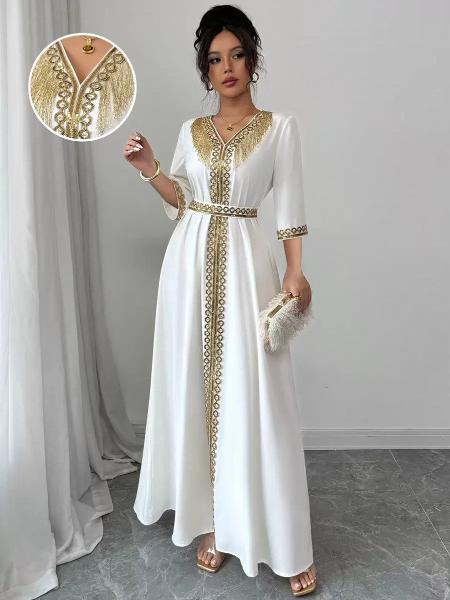 Women’s Vintage V-Neck Sequin Tassel Patchwork Midi Dress